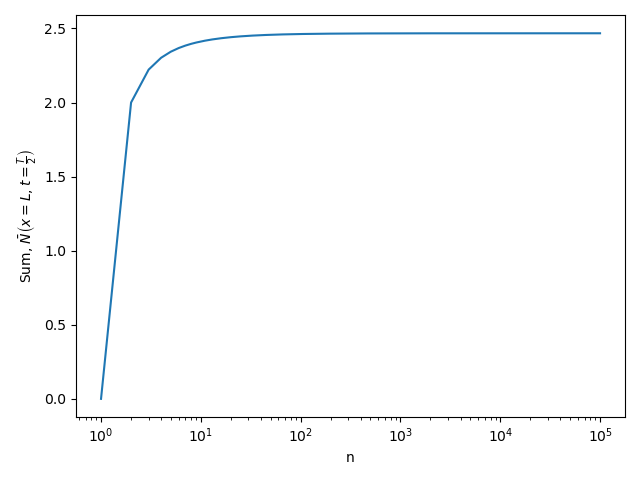 The summation term, \(\bar{N}\left(x, t\right)\), may be evaluated at the location \(x = L\) and time \(t = \frac{T}{2}\) to help determine the load \(P_0\) to be applied in the Abaqus simulation. The plot below shows that this series tends to converge to a value of 2.6474 (at \(n = 100,000\)) which may be used to determine \(P_0 = -29.6881 N\). The negative value of this load indicates compression and agrees with the sign convention in Figure 25.