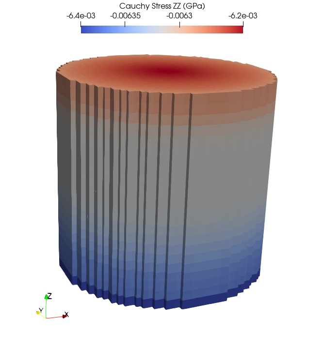 The Cauchy stress (ZZ component) is plotted for the final time step in Figure 43 showing that stress is approximately uniaxial varying from -6.2 to -6.4 MPa with higher stresses concentrated on the bottom.