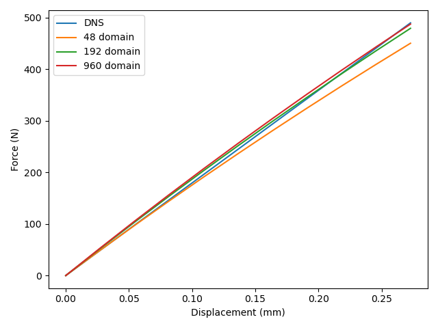 DNS results are converted to the required XDMF file format in a very similar way to what is described in Ratel elastic cylinder - Quasi-static Implicit. Here, filtering domains with 1, 24, 48, 192, and 960 macroscale elements are used, however, only the results of the 48, 192, and 960 element cases will be discussed.