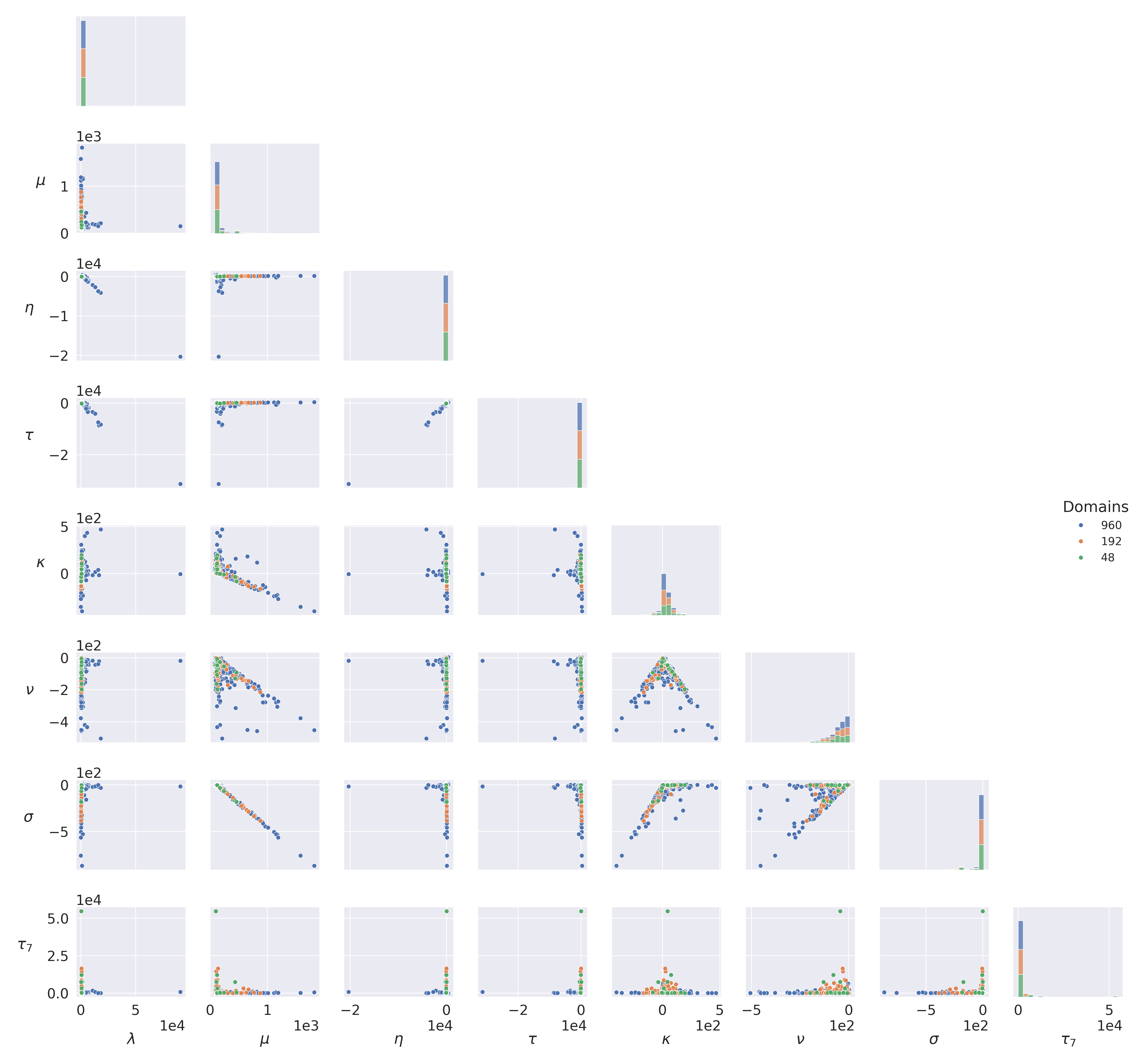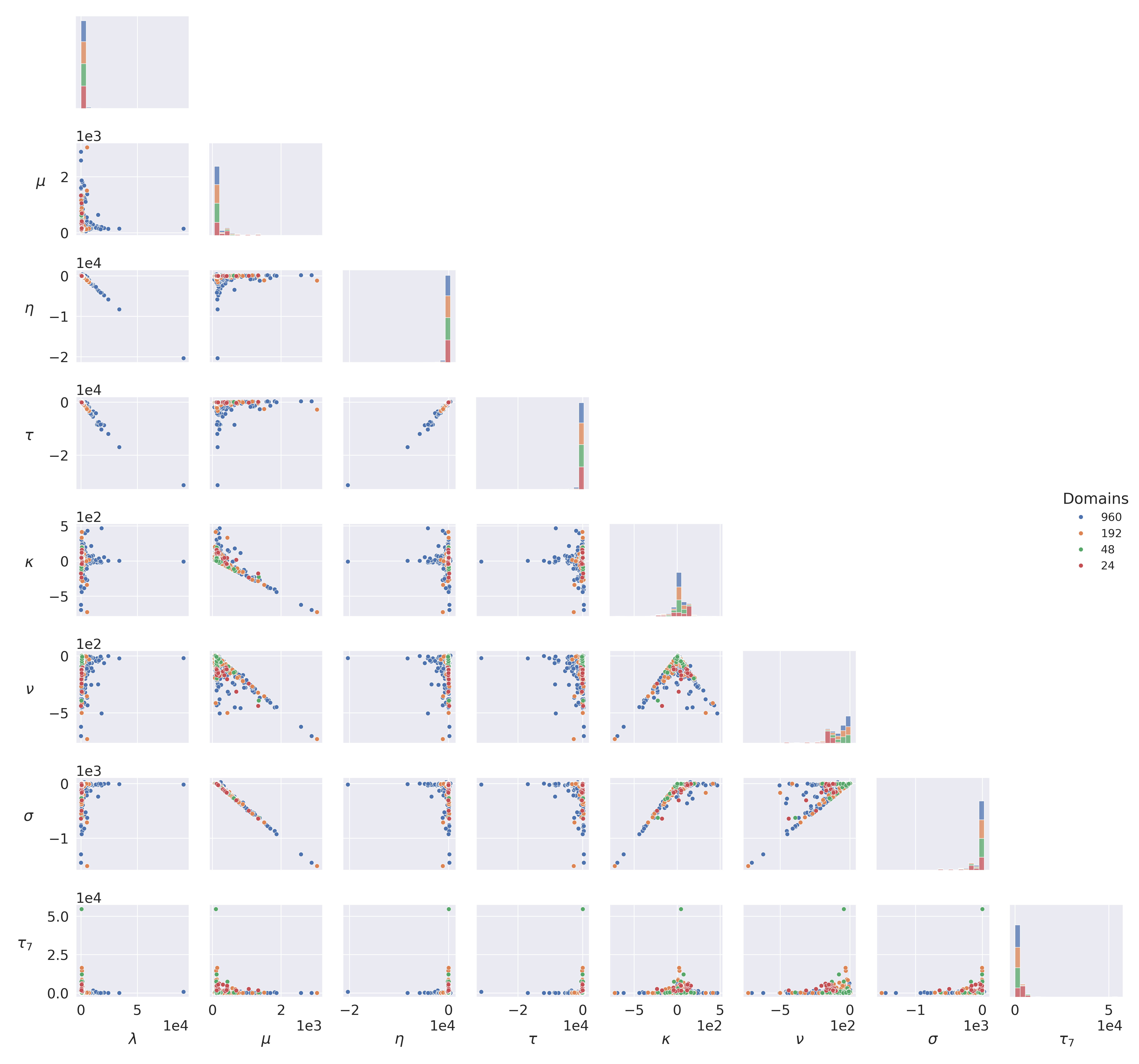 The histograms (which are stacked) shown on the diagonal of the joint plot indicate that most of the calibrations are similar, but the off-diagonals sub-plots show that parameter calibrations may deviate significantly from the average. This deviation increases dramatically as the number of filtering domains increase (e.g., the 960 domain case shown in blue). Additionally, it is clear that most parameter calibrations are strongly correlated (such as the plot for \(\sigma\) compared with \(\mu\)). It is difficult to determine if these correlations are “real” or just a byproduct of the approach.
