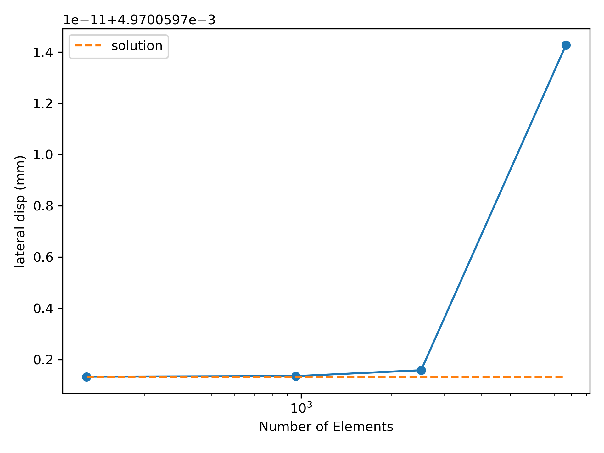 The total force depends on the final deformed area of the cylinder, so it is expected that the lateral displacements in the Tardigrade-MOOSE simulations agree with the analytical solution since the total force appears to converge. The lateral (or radial) stretch solved for this problem, following Eq. (13), is found to be \(\alpha_r = 1.001988\). The analytical lateral displacement may then be calculated as: