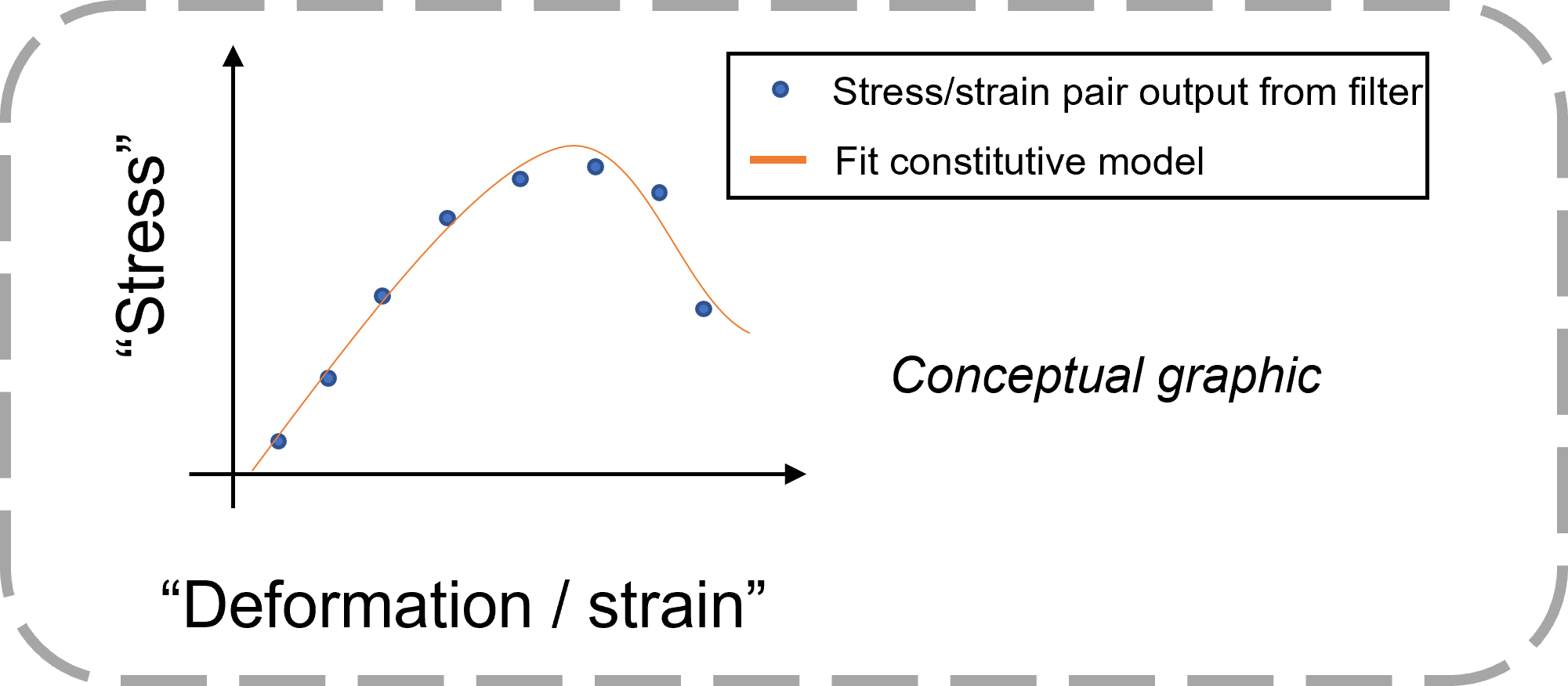 After DNS results have been homogenized through the Micromorphic Filter, constitutive models are calibrated. Calibrated models are then applied to Tardigrade-MOOSE simulations. Figure 4 illustrates the calibration methodology in which pairs of stress and deformation quantities output by the Micromorphic Filter are used as the data to inform constitutive model parameters. Calibration is conducted for quantities in the reference configuration. In reality, the filter outputs 45 stress components (9 for symmetric micro-stress, 9 for Second Piola-Kirchhoff stress, and 27 for higher order stress) and provides quantities which may be used to compute 45 deformation tensor components (9 for micro-strain, 9 for Green-Lagrange strain, and 27 for micro-deformation gradient).